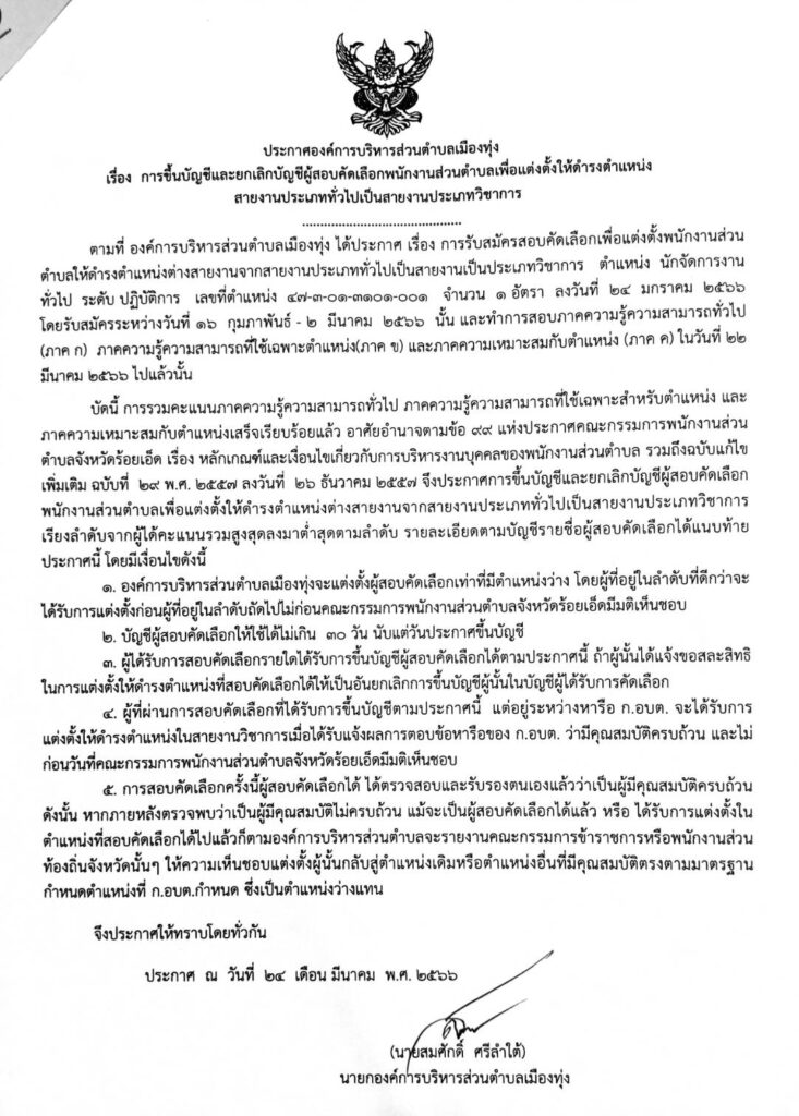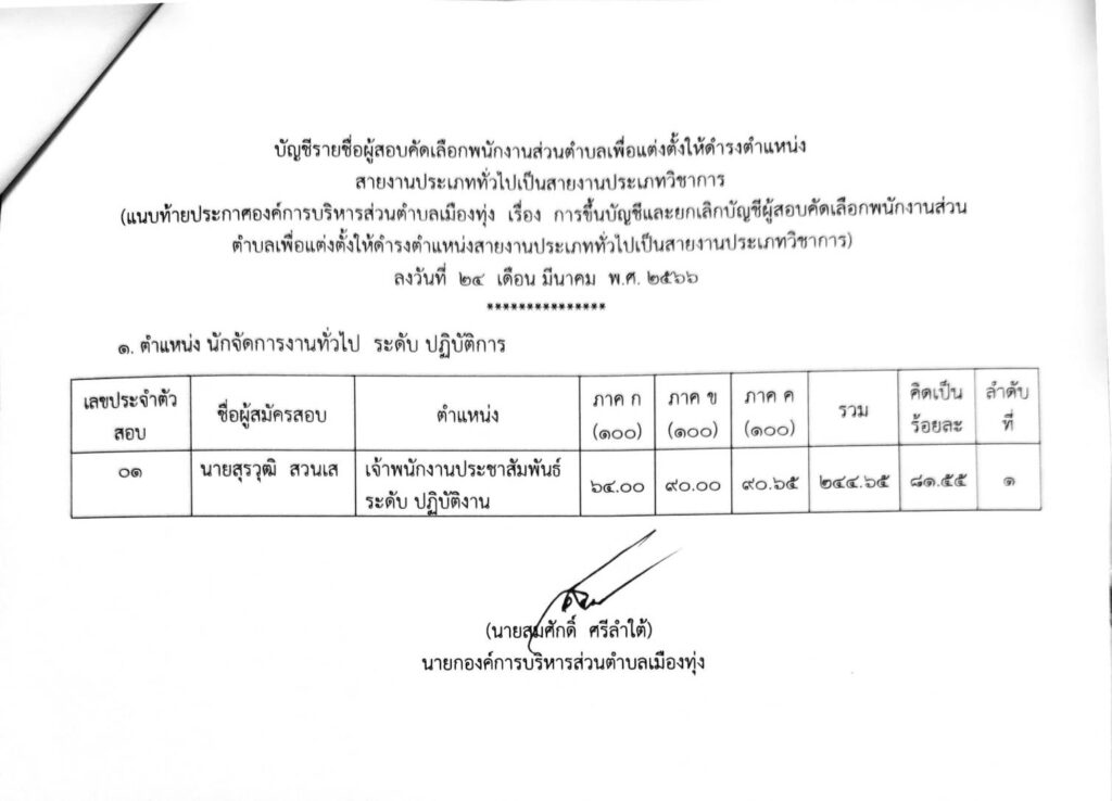 บัญชีรายชื่อผู้สอบคัดเลือกพนักงานส่วนตำบลเพื่อแต่งตั้งให้ดำรงตำแหน่ง สายงานประเภททั่วไปเป็นสายงานประเภทวิชาการ (แนบท้ายประกาศองค์การบริหารส่วนตำบลเมืองทุ่ง เรื่อง การขึ้นบัญชีและยกเลิกบัญชีผู้สอบคัดเลือกพนักงานส่วน ตำบลเพื่อแต่งตั้งให้ดำรงตำแหน่งสายงานประเภททั่วไปเป็นสายงานประเภทวิชาการ)