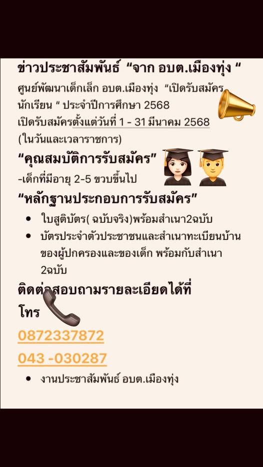 ศูนย์พัฒนาเด็กเล็ก อบต.เมืองทุ่ง เปิดรับสมัครนักเรียน ประจำปีการศึกษา 2568 เปิดรับสมัครตั้งแต่ 1-31 มีนาคม 2568 (ในวันและเวลาราชการ)