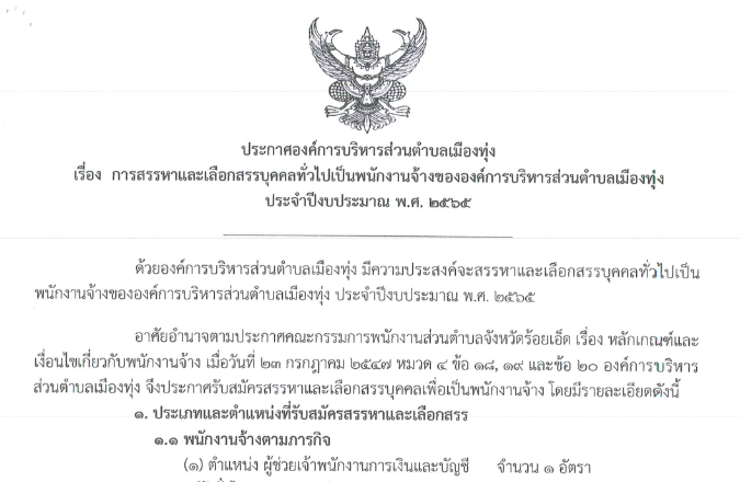 ประกาศ รับสมัคร พนักงานจ้างตามภารกิจ ตำแหน่ง ผู้ช่วยเจ้าพนักงานการเงินและบัญชี จำนวน 1 อัตรา รายละเอียดตามเอกสารแนบ รับสมัคร ผู้ช่วยเจ้าพนักงานการเงินและบัญชีดาวน์โหลด แนะแนวเรื่อง ขอเชิญเที่ยวงานบุญบังไฟ ประจำปี 2565 ประเพณีบุญบั้งไฟ อบต.เมืองทุ่ง ปี พ.ศ. 2565