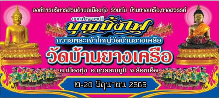 องค์การบริหารส่วนตำบลเมืองทุ่งร่วมกับชาวบ้าน บ้านยางเครือขอเชิญเที่ยวงานบุญบังไฟประจำปี 2565 ในวันที่ 19-20 มิถุนายน 2565 ณ วัดบ้านยางเครือ ม.2 ต.เมืองทุ่ง อ.สุวรรณภูมิ จ.ร้อยเอ็ด