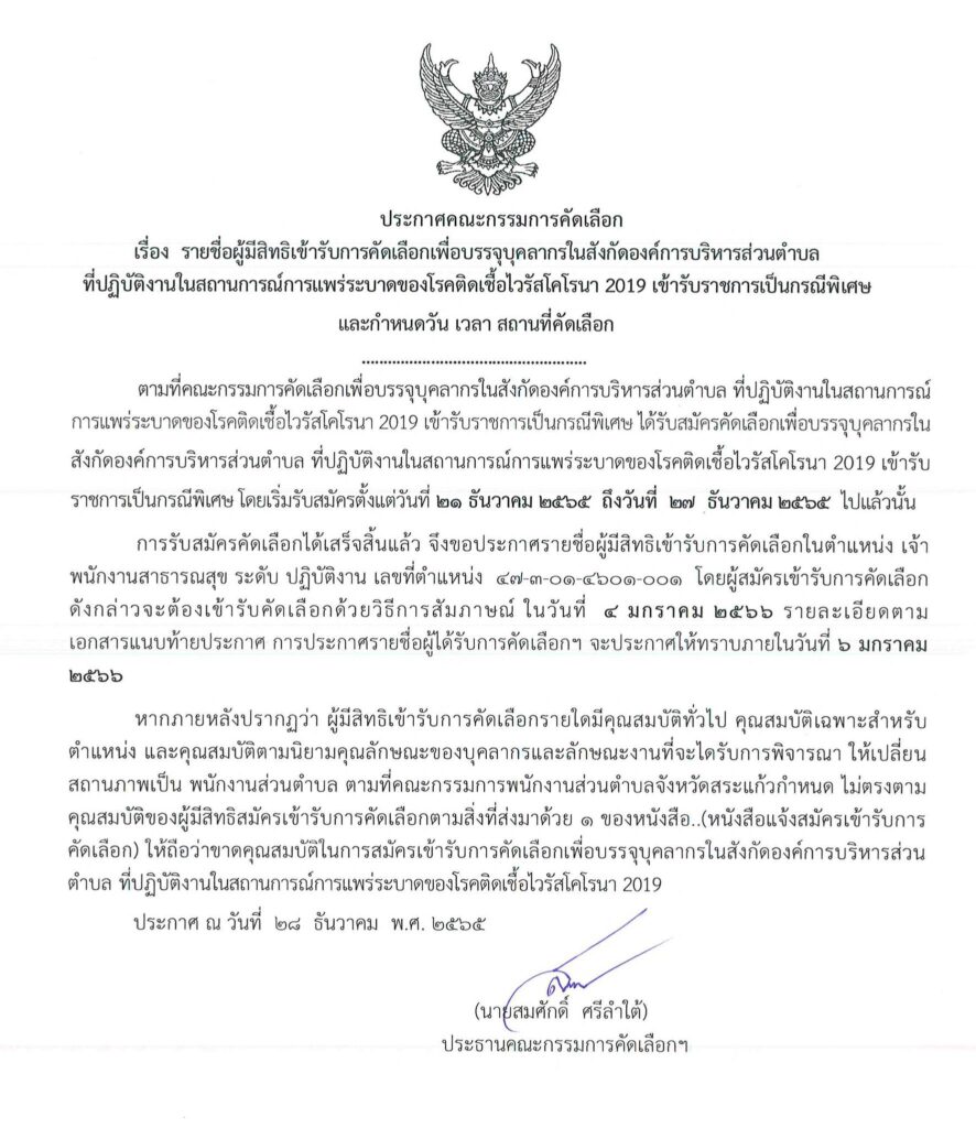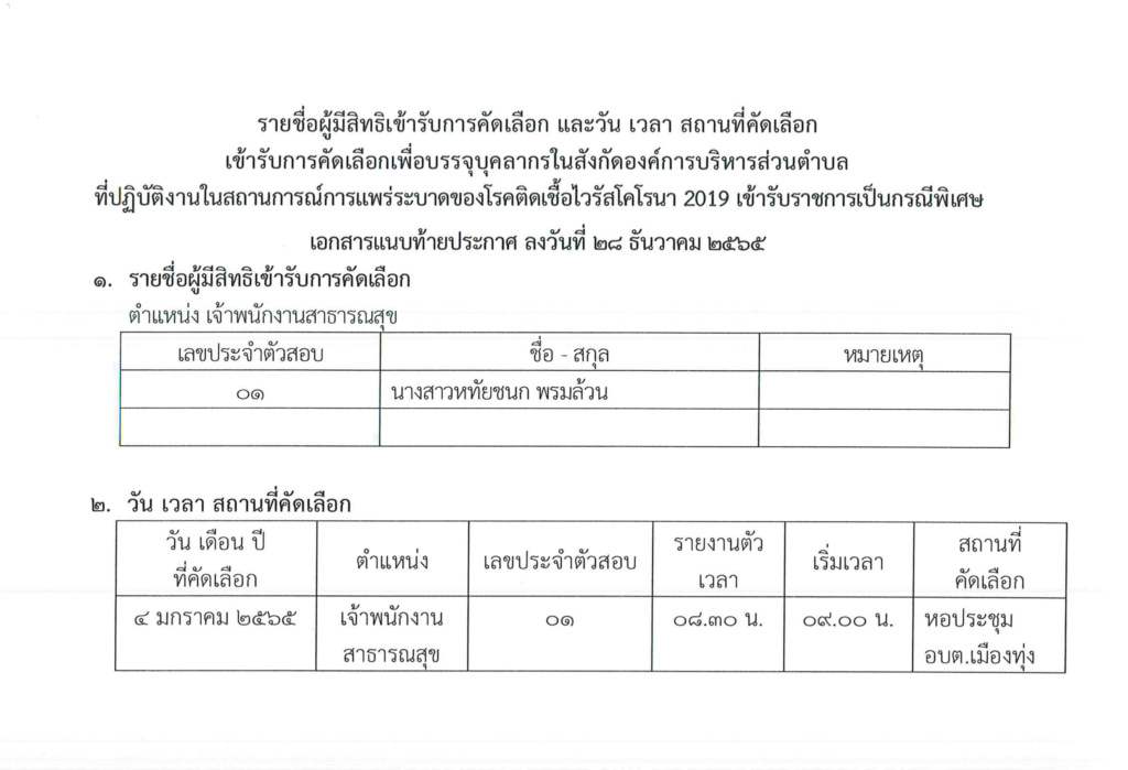 ประกาศรายชื่อผู้มีสิทธิเข้ารับการคัดเลือกเพื่อบรรจุบุคลากรในสังกัด อบต.เมืองทุ่ง ที่ปฏิบัติงานในสถานการณ์การแพร่ระบาดของโรคติดเชื้อไวรัสโคโรนา 2019 เข้ารับราชการเป็นกรณีพิเศษ